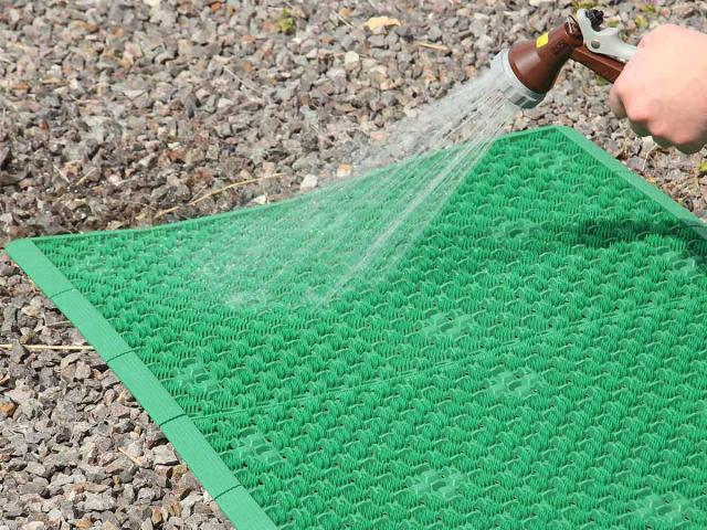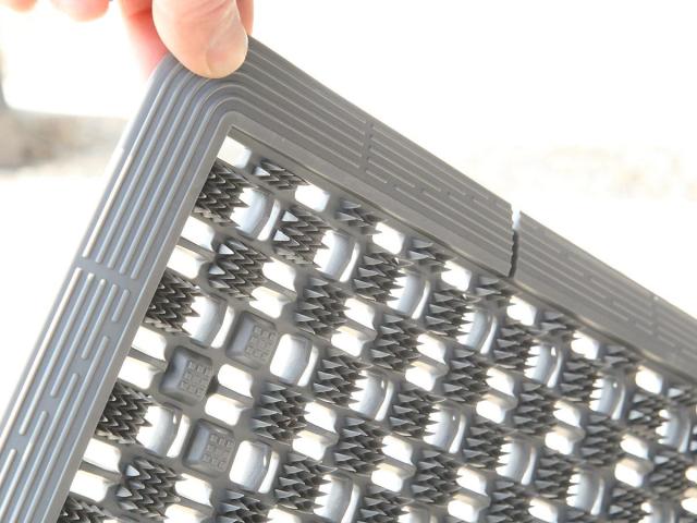 泥が溜まりにくい穴あきタイプのマットです。大きな水抜き穴で目詰まりしにくい構造になっており、高い排水性能も確保しています。