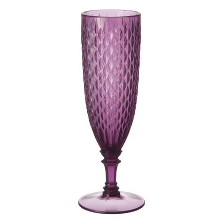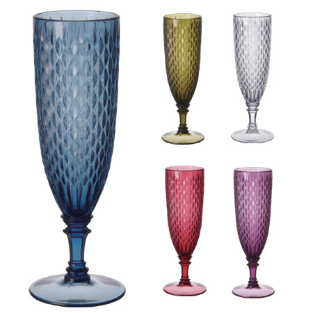 ステムは短め、エンボスが美しいヨーロッパのアンティーク調シャンパングラスROSETTE。軽くて割れにくいプラスチック製なのでパーティー仕様にぴったり。