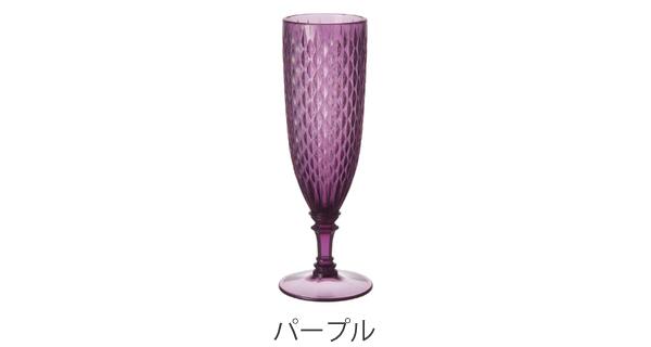 光を美しく反射する木の葉型のエンボスをカップ全体にあしらった樹脂性のシャンパングラス。