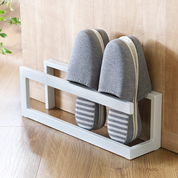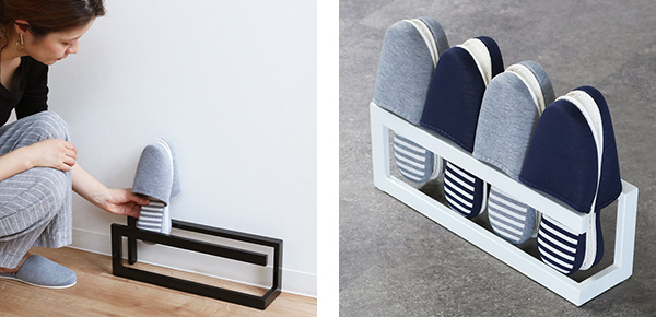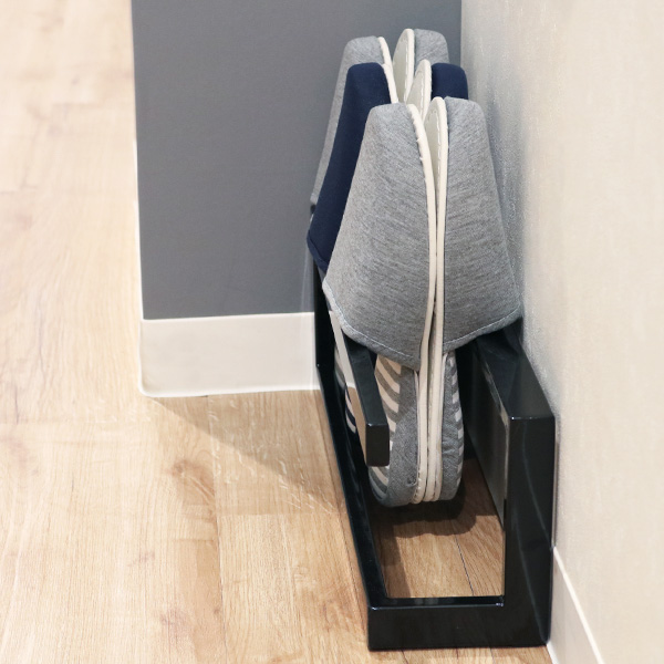 裏面を重ねて2本のフレームに差し込むだけの機能的なデザイン。スリッパの出し入れもストレスなくおこなえます。4足収納可能なので、ご夫婦・ご家族でもお使いいただけます。