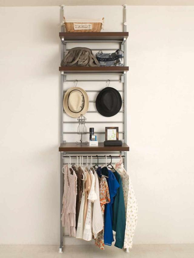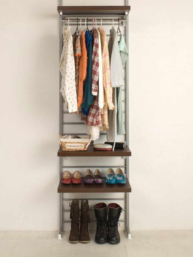 棚板はラダー部分の10cmピッチで移動ができます。ハンガーラック付きの棚板を高めにセットしてワンピースなど丈の長い衣類を掛けたり、棚板下を広めにとってロングブーツを収納したりと、収納物に合わせて高さを調節していただけます。