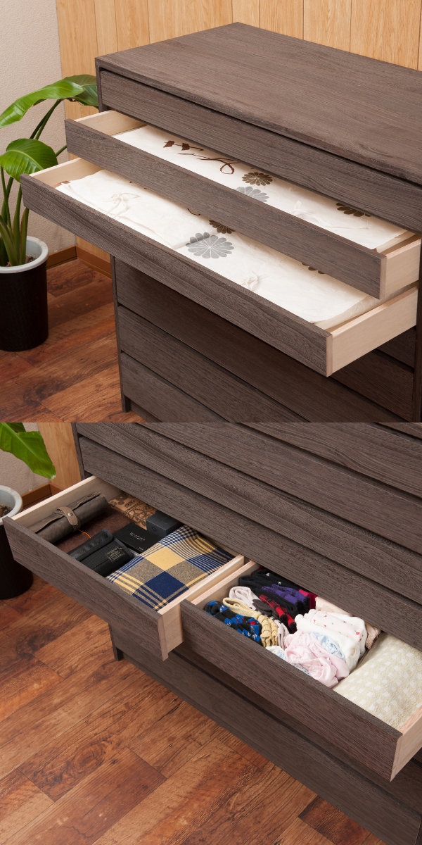 よくあるチェストや箪笥は奥行33〜34cmのものが多いですが、この桐箪笥は奥行39.5cmあり、着物をたとう紙にいれたまま収納できます。また、深さの異なる3種類の引出しがあり、収納するものにあわせて使い分けて収納できます。