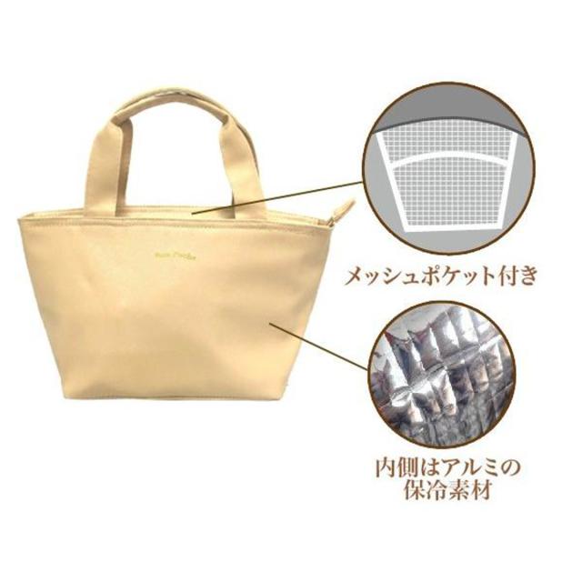 内側はアルミ素材なので、飲食物の鮮度をキープします。保冷剤や小物を入れるのに便利なメッシュポケットが付いています。