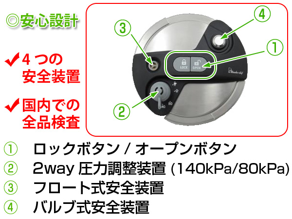 | 備考 | 作動圧力(切替式):(普通圧)80kpa/(超高圧)140kpa |