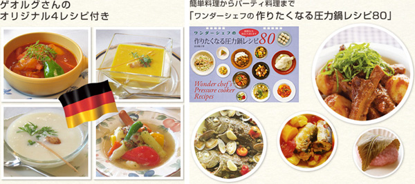 リング式で使いやすいレシピ集、浜田陽子著「ワンダーシェフの作りたくなる圧力鍋レシピ80」つき。さらに、老舗ドイツ料理店「エルナ・アドリアーン」のオーナーシェフ、ゲオルグ氏監修のドイツ料理レシピも一緒にお届けします。離乳食から生活習慣病予防まで、幅広いレシピが載っているので、毎日の食卓のレパートリーも増えそうです。
