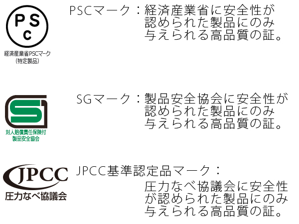 ワンダーシェフの家庭用圧力鍋には、SGマーク、PSCマーク、JPCC基準認定品マークといった3つのマークがついています。