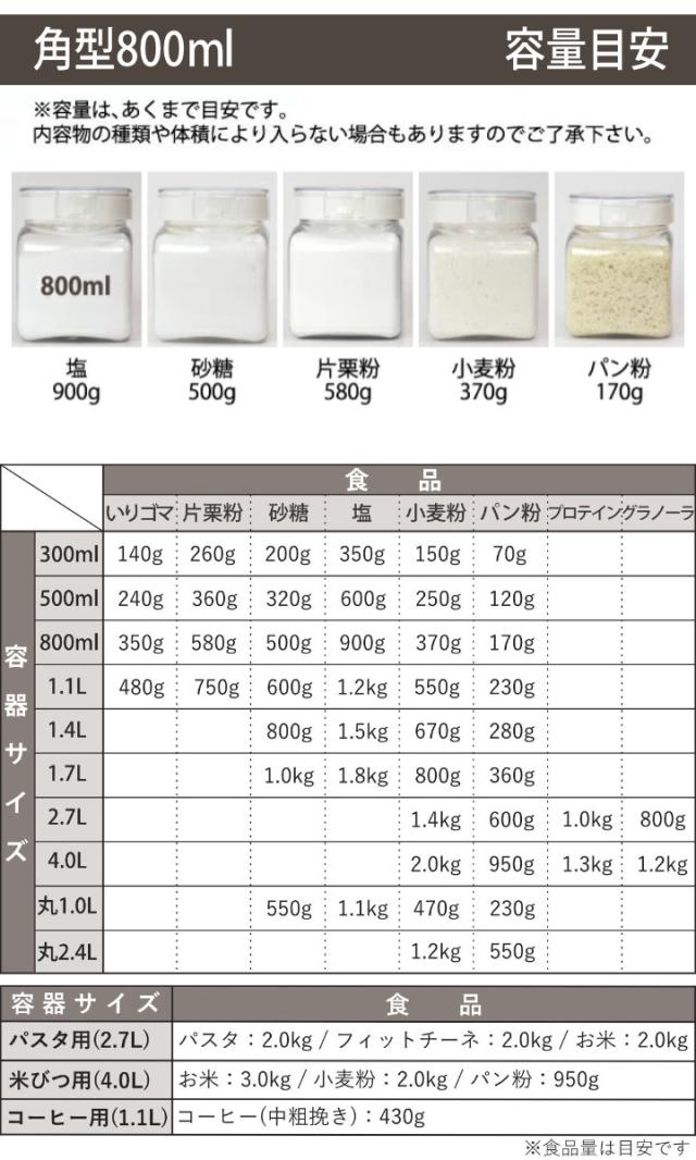 たっぷりの調味料を入れて保存しておくのに便利なサイズです。砂糖や小麦粉、片栗粉などの粉ものにピッタリ。だし昆布や乾燥わかめ、マカロニなどの乾物の保存にも◎これから新生活を始める方はもちろん、すでに持っていて増やしたい方にもおすすめです。