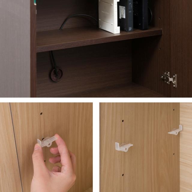 庫内の棚板は可動式で、収納したい物に合わせて調節することができます。また、棚板の後方には1cmの隙間を設けているので棚板をまたいでの配線も可能です。棚板を受ける金具は、落下防止などの安全を考慮したダボを採用しています。