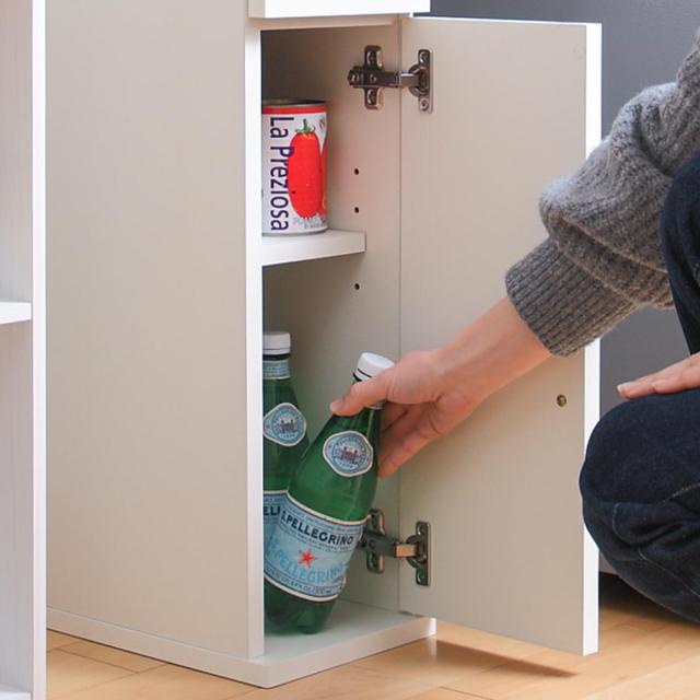 下部スペースには開き戸収納が設けられています。2Lペットボトルが4本収納可能で、高さのある物や日用品のストックなどすっきりと収納できます。
