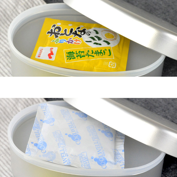 安心の内フタ付き内フタ付きで汁もれの心配が少なく安心です。 (※完全な密閉性はありませんので、汁ものを入れた場合は横にしないでください) | ◇ | 便利なスペース内フタとフタの隙間を利用してふりかけや保冷剤を収納することができます。 熱伝導が良いので保冷剤の冷たさがお弁当全体に伝わり、夏場はお弁当が傷むのを防いでくれます。 |