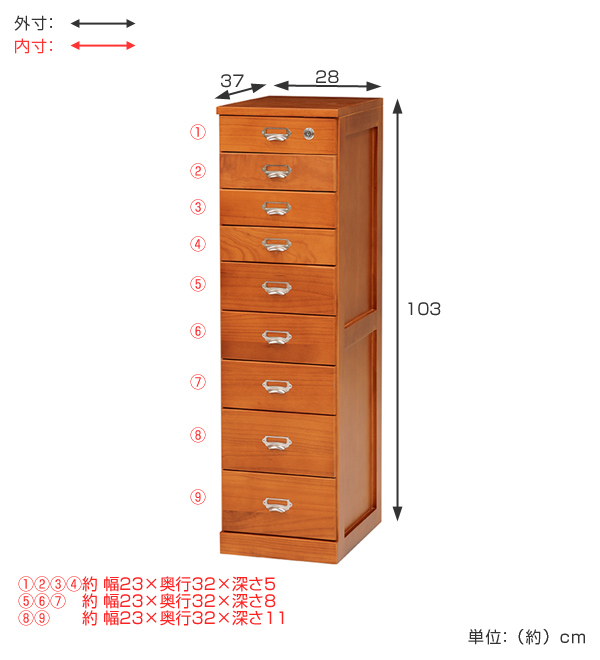 優れた性質を持つ桐材使用の9段チェスト 幅28cm