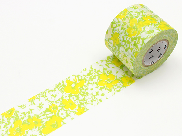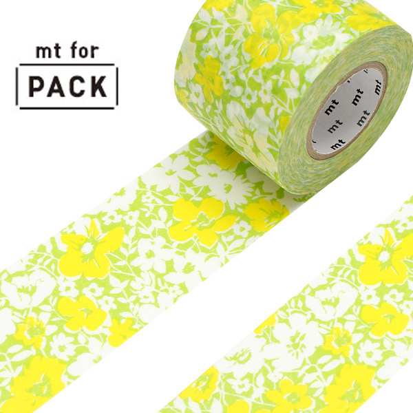 ナチュラルな雰囲気にイエローのアクセントがかわいい花柄です。かわいい柄の「mt for PACK」は梱包用テープとしてだけでなく、ラッピングや小物のアレンジにもおすすめです。