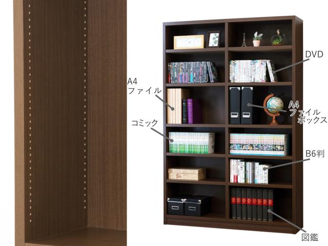 棚板は収納したいものの高さに合わせて調節できる可動棚です。1.5cmピッチで細かく調節ができるので、高さの違う本でも無駄なくまとめて収納することができます。左右の棚板は、各々で調節できます。