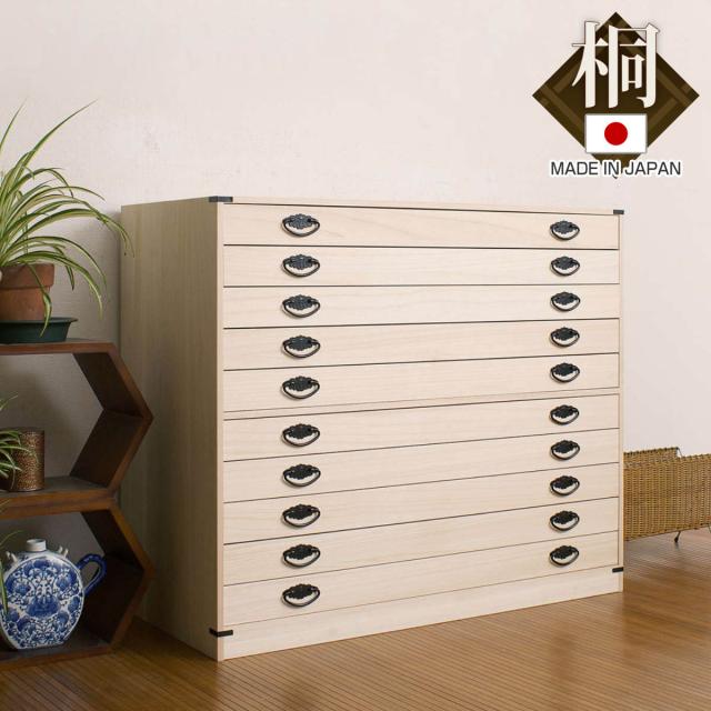 桐タンス 幅99.5cm 浅型 10段 台輪あり 着物用 日本製 ( 桐箪笥 収納 桐チェスト 国産 完成品 桐 たんす タンス 箪笥 積み重ね 桐衣装箱 着物収納 衣類収納 チェスト 天然木 )