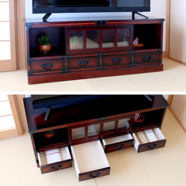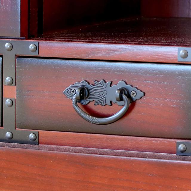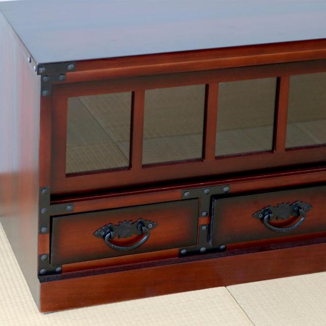 引戸収納が2箇所、引出し収納が4箇所付きなので収納もしっかり出来ます。引戸はガラス仕様で中が見えるので和雑貨などのディスプレイにもぴったりです。