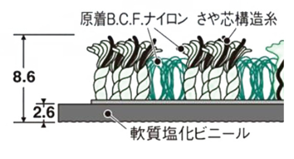 | 材質 | 表面:ナイロン100%(さや芯構造糸、原着B.C.Fナイロン) 裏面:軟質塩化ビニール |