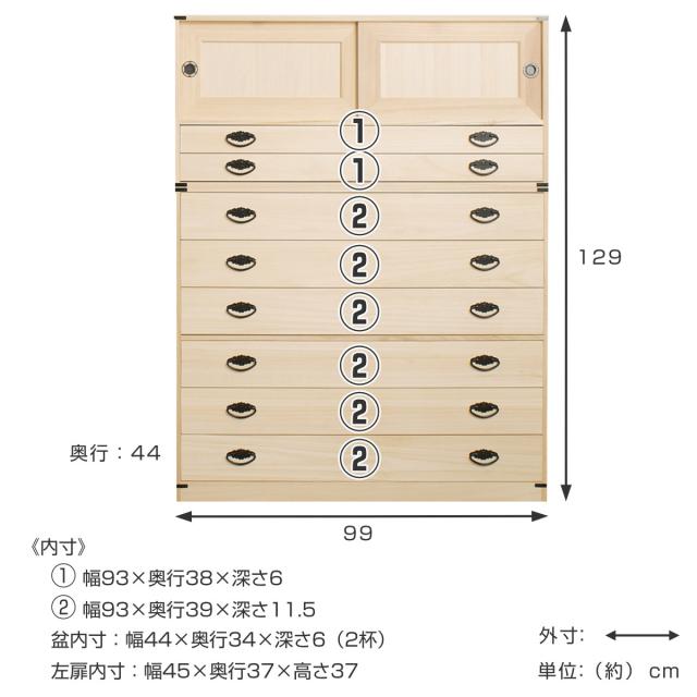 桐タンス 8段 引き戸タイプ 着物用 幅99 高さ129cm ( 桐たんす 桐 タンス たんす 箪笥 桐箪笥 日本製 着物収納 完成品 桐衣装ケース 桐チェスト 桐衣装箱 和箪笥 チェスト 八段 引戸 国産 着物 衣類収納 )