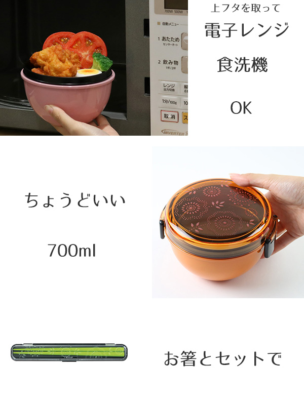 どんぶり型のお弁当箱は大きめに見えますがこちらのランチボウルは700mlなので女性にピッタリなサイズです。レンジ対応、食洗機対応なのでお手入れも簡単。同じデザインのお箸とセットで揃えればランチタイムをより華やかに楽しく彩ることができます。