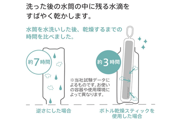 水筒の中に残る水滴もすばやく乾かします水筒を水洗いした後、乾燥するまでの時間を比べました。逆さにした場合、乾燥までに約7時間かかりますが、ボトル乾燥スティックを使用した場合、約3時間で乾燥します。