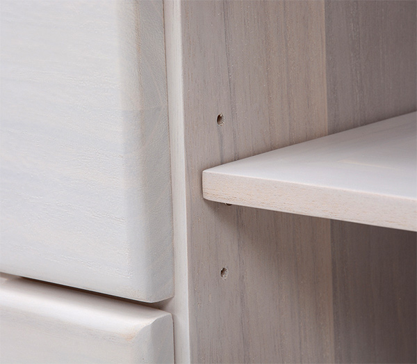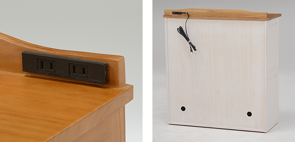 | コンセント付き 2口コンセント付きなので、スマホやデジタルフォトフレーム置き場としてもオススメです。 | 背面化粧 裏も塗装仕上げをしてありますので、お部屋の間仕切りにもご使用いただけます。 |
