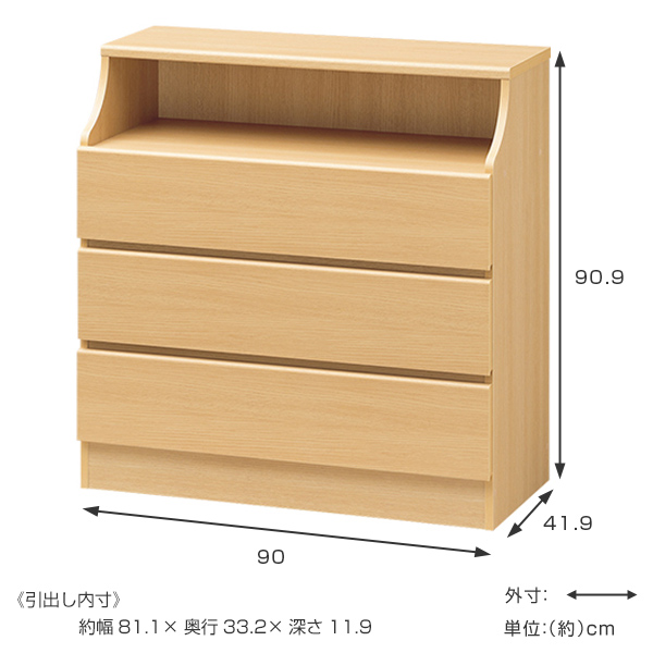 3段、幅90cmのサイズは、収納を増やして部屋をすっきりさせたい、という時にピッタリです。引出しに加えて、オープンスペースもあるので、頻繁に使うものをすぐに取り出せて便利です。