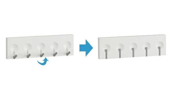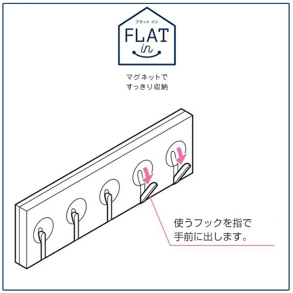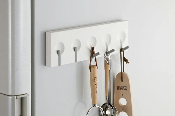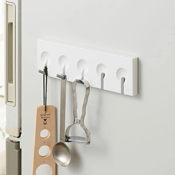 冷蔵庫横やスチール面などマグネットがつくところなら簡単に取り付けられる5連フックです。何度でも取り外しができ、使いやすい位置に自由に設置ができます。