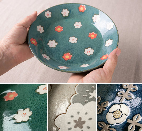 光沢がありつるっとした手触りです。花模様の部分のみ釉薬が塗られずマットな質感で、味わい深い仕上がりです。