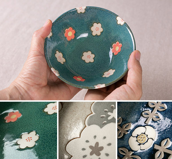 光沢がありつるっとした手触りです。花模様の部分のみ釉薬が塗られずマットな質感で、味わい深い仕上がりです。