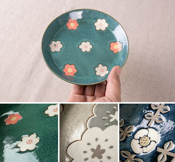 光沢がありつるっとした手触りです。花模様の部分のみ釉薬が塗られずマットな質感で、味わい深い仕上がりです。