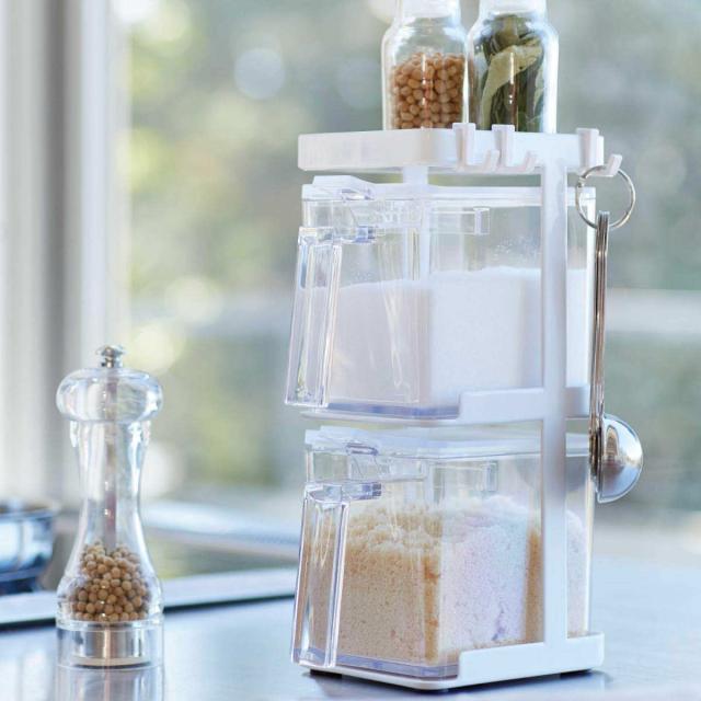 砂糖や塩などを入れておくのに便利な調味料ストッカーL(約650ml)2個とスリムなラックのセットです。縦に収納できるので、調理スペースを広く取れて、快適にキッチン仕事ができます。一番上の段にスパイスボトルを置いても、落ちないようガード付きで安心です。