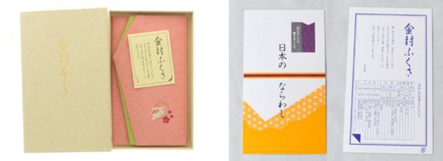 | 箱入り 金文字の入った紙箱入ですので、保管も安心です。 | 日本のならわしラベル シーンごとの、金封包の表書き諸例が書かれたラベルです。 |