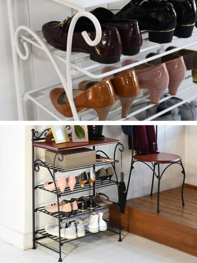 扉付きのシューズラックに比べて風が通りやすく、嫌な湿気やニオイがこもりません。4段のラックで収納力も抜群です。