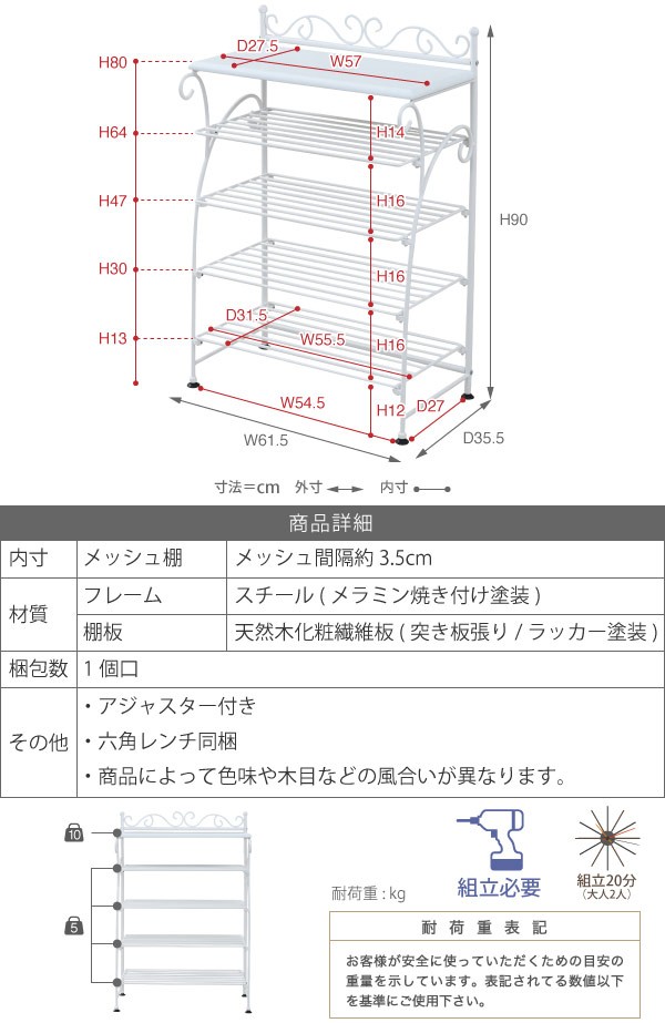 | 耐荷重 | 天板:約 10kg メッシュ棚:約 5kg |