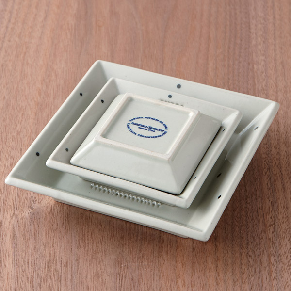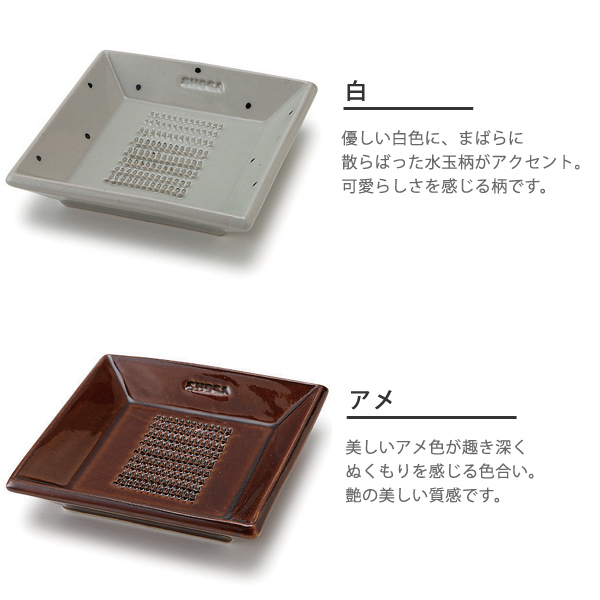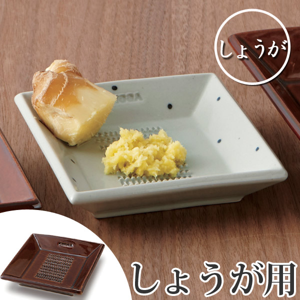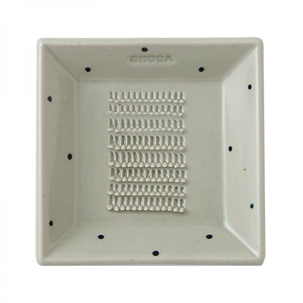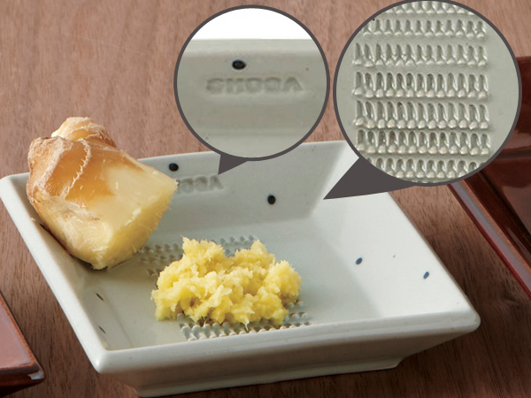 食材にあったおろし方ができる、陶器製おろし器 SHOGA 11cm四角いお皿の中央に、おろす薬味に合ったおろし目を持つ、陶器製おろし器です。薬味を載せて食卓に出し、各々でおろしていただく、そんな贅沢な場を食卓の場に。自慢したくなる愛用品に。
