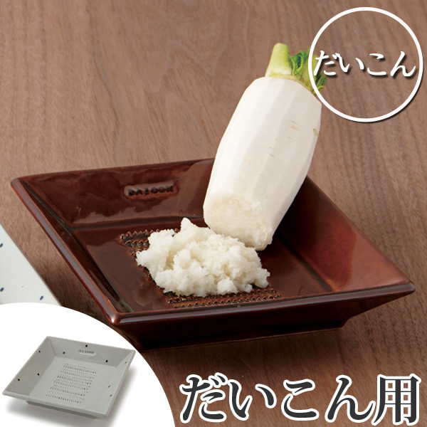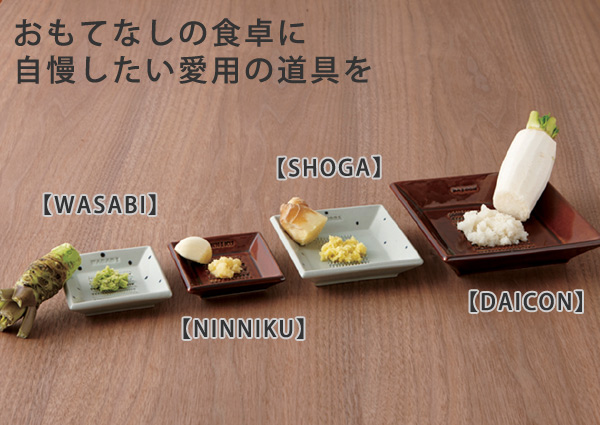 薬味によって使い分けるおろし器シリーズ「WASABI」「NINNIKU」「SHOGA」「DAICON」の4種類。それぞれの薬味に合う目でおろせる、陶器製おろし器シリーズです。美濃焼の上質さと愛らしさを持ち合わせ、そのまま食卓に出せるデザインです。おもてなしの場や、いつもの食卓に、こだわりとお気に入りをプラスしてくれます。すべて安心の日本製の商品です。