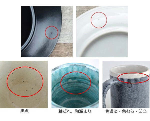 陶器・磁器商品の特性について陶器・磁器商品では、上記のような特性がみられる場合があります。これらは、原料となる土に由来するもの、手作業で行う工程で生じるもの、また焼成する際の火の当たり方や技法によるものなど、陶器・磁器商品の特性です。ひとつひとつのうつわの持つ個性、温かみある風合いとしてお楽しみいただければ幸いです。※写真の赤い丸で囲んだ部分など、色濃淡、色むら、色や柄のずれ、凹凸等の度合いは、商品によって異なります。※上記理由による、返品・交換はお受けできません。ご了承の上お買い求め下さいますようお願い致します。