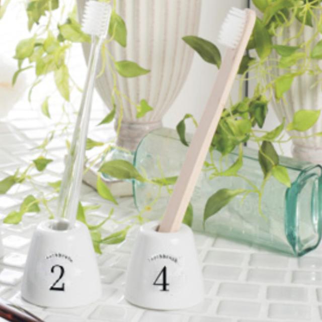少しレトロなフォントのナンバーが入った陶器製歯ブラシホルダーです。 歯ブラシ一本をスッキリと立てられます。つややかなホワイトカラーをベースとしたデザインで、清潔感のある空間を演出します。陶器製なので安定感があり、歯ブラシが倒れる心配もありません。