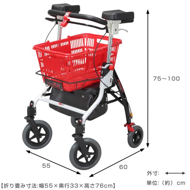 | サイズ | 本体:約 幅55×奥行60×高さ75〜100(cm) 折り畳み時:約 幅55×奥行33×高さ76(cm) 座面:約 幅37×奥行27×厚み3.5(cm) 座席高さ:約47cm グリップ内寸:42cm |