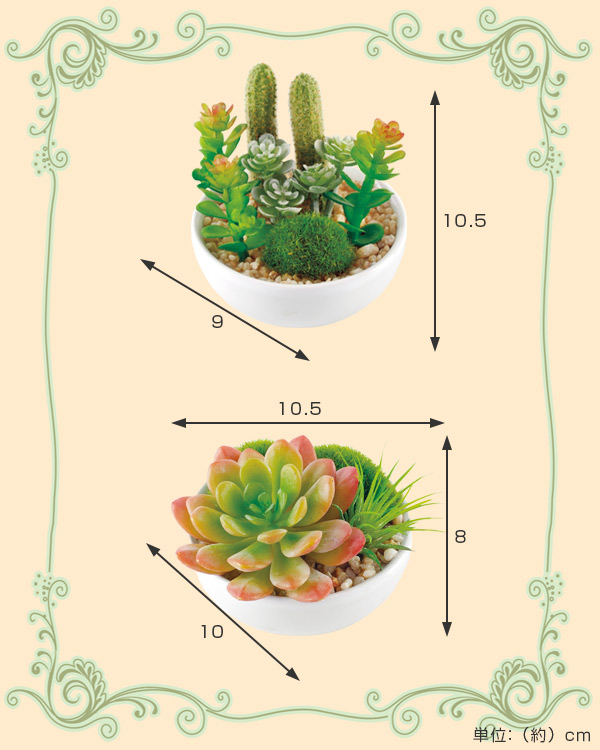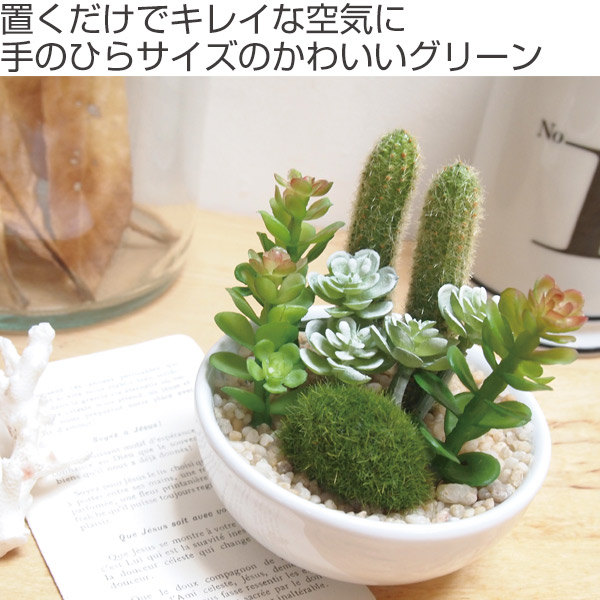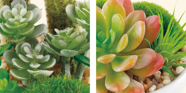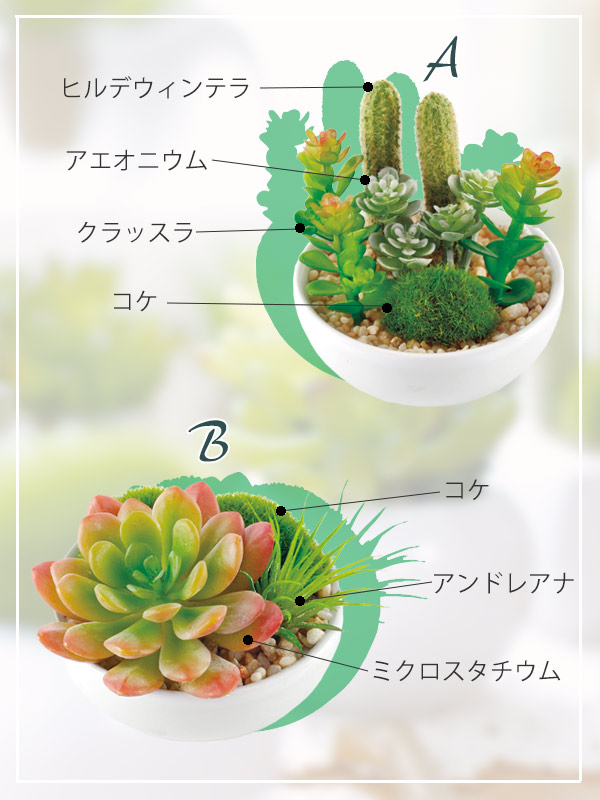 | まるで本物 こんもりとしたコケや、サボテンのトゲトゲがまるで本物のようです。 | 多肉植物のぷっくり感がリアル 多彩でリアルなグリーンは華やかでボリューム感があります。 |
