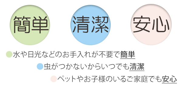 かわいい手のひらサイズなので、玄関や洗面所、デスクなどちょっとした場所にも置きやすいグリーンです。お手入れ不要、「簡単」「清潔」「安心」なグリーンでお気に入りの場所に彩りを添えていただけます。