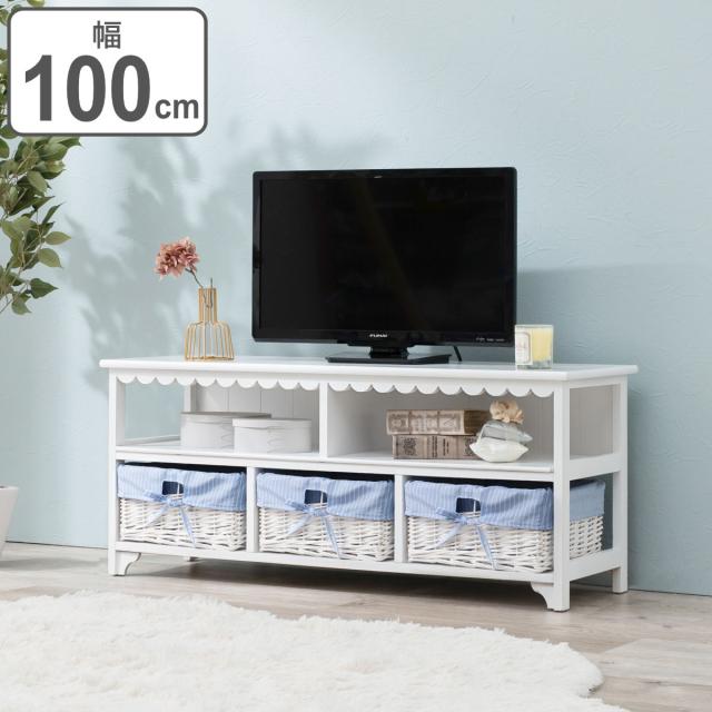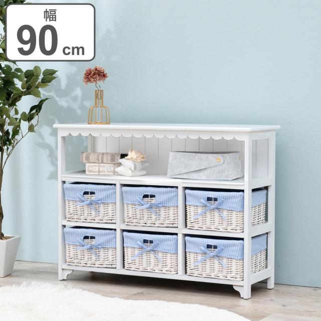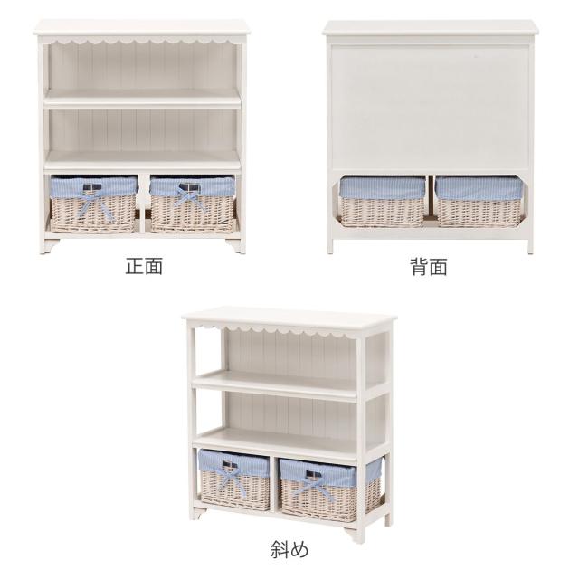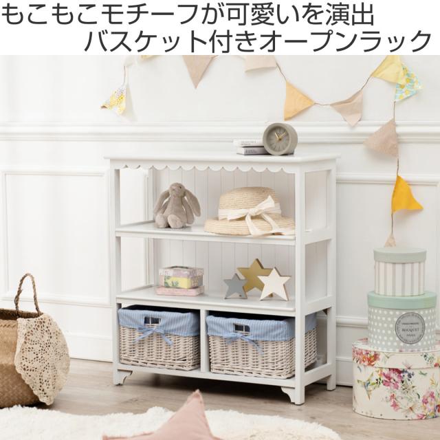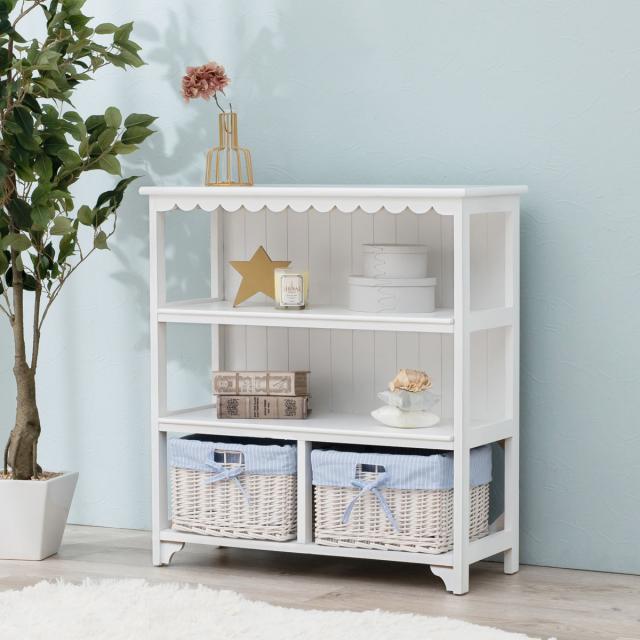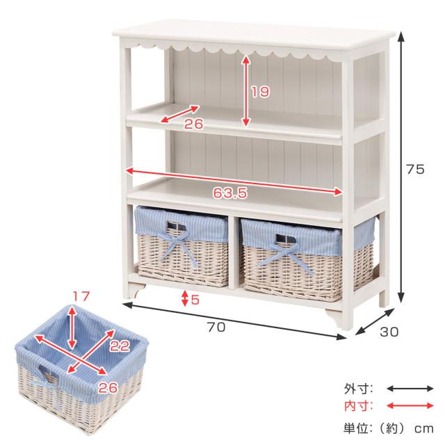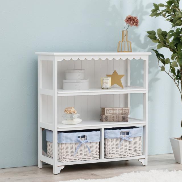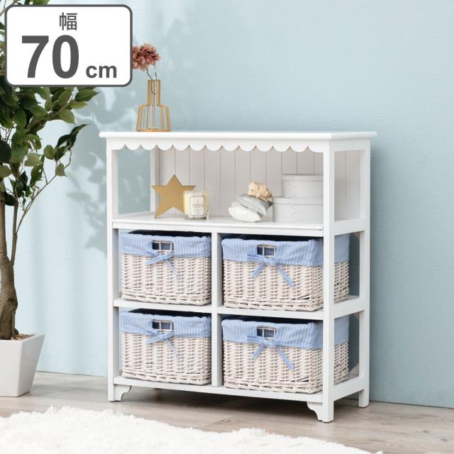 オープンラック 3段 編みカゴ 引出し2杯 姫系 カントリー調 幅70cm ( ラック 飾り棚 シェルフ 収納棚 桐製 バスケット付 天然木 完成品 木製ラック 収納ラック 棚 ウッドラック 収納 本棚 ホワイト ブルー 白 おしゃれ )