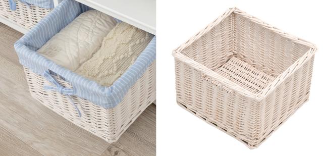 リビング周りの小物や衣類の収納にも便利なバスケット付きです。取り外し可能な内布付きで、デリケートな衣類やブランケットなども痛めにくく安心です。内布の爽やかなカラーが本体のデザインを引き立てます。