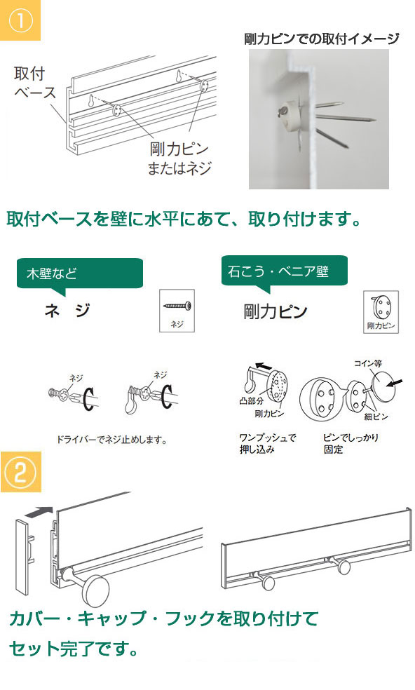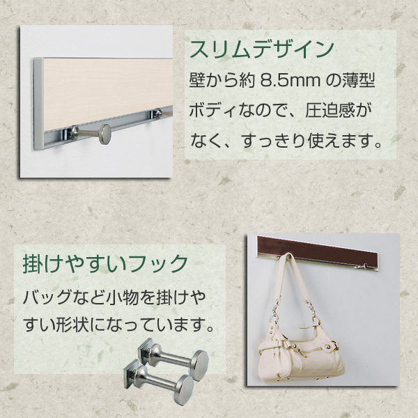 ![]() ![]() ![]() 機能性に優れた本体 薄型ボディで、すっきりとしたデザインのため、お部屋の雰囲気を壊しません。また、フック2個が付属しており、ハンガーやバッグを掛けるのに便利です。 ![]() 色々な壁に対応 取り付け場所は、石こうボード壁・ベニヤ壁・木壁・木桟に対応しています。 ![]()
