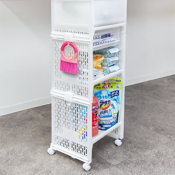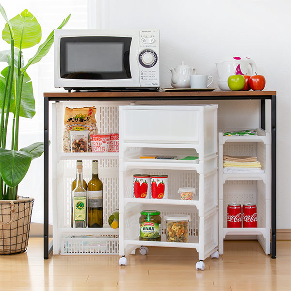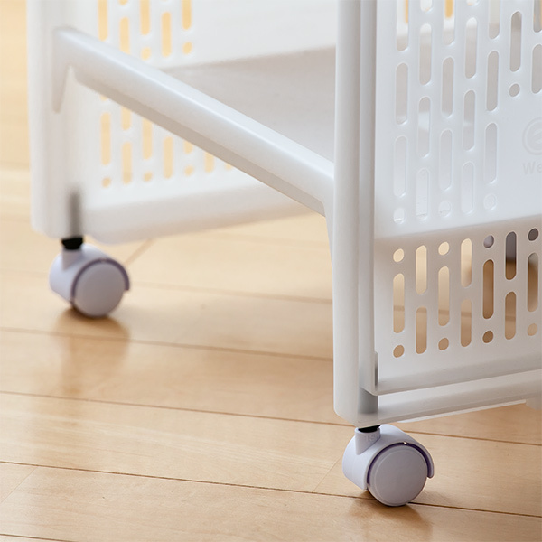 キャスターを取り付けると、移動がラクになるだけでなく、床から約4cm高くなり、ラック足元の空間やバスケットと組み合わせた時の収納空間が広くなります。収納物の容量が増え、背の高いものも収納することができ、大変便利です。