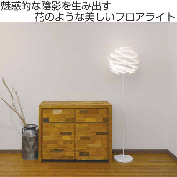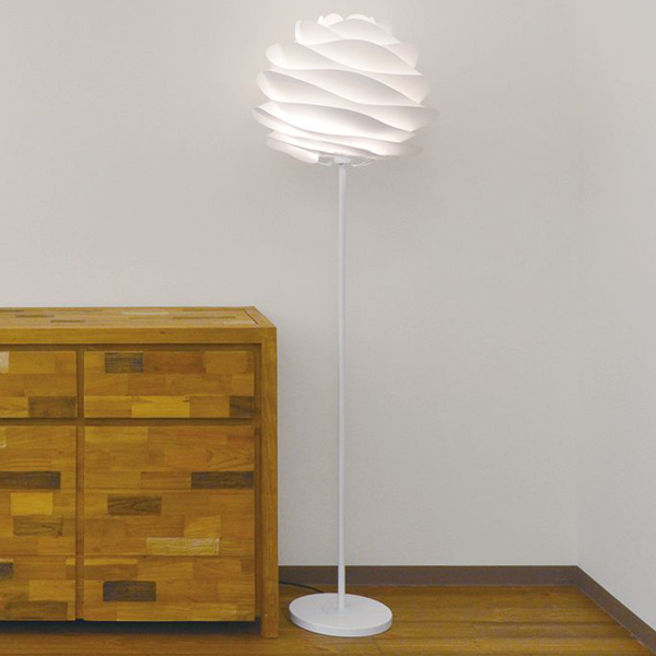 花のようなドレスをまとった美しいライトです。剥いたりんごの皮にも似た羽を6枚重ね、魅惑的な陰影を生み出しました。幾何学的で植物をイメージさせるデザインは、まさに北欧デンマークの得意とするところです。点灯している時はもちろん、消灯時もインテリアとして楽しむことができます。リビングのソファサイドや寝室のベッドサイドなど、少し灯りが欲しい場所などにおすすめです。フロアライトのみ点灯すると幻想的な雰囲気に包み込まれ、癒しの空間を演出してくれます。