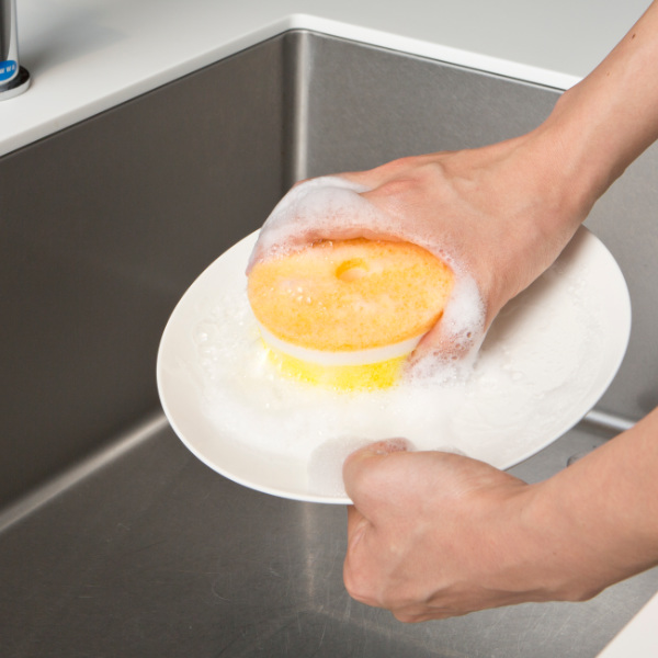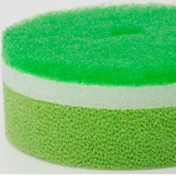 表面のナイロン不織布層はガンコ汚れやフライパン等の磨き上げに。中間のウレタンフォーム層は少量の洗剤でもしっかりキープ。脱膜ウレタン層は水切れ、泡立ちが良く耐久に優れています。