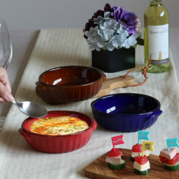ころんとしたフォルムが可愛らしいラウンド皿です。取っ手付きで、調理中も食べるときも扱いやすいく、1人分のグラタン、ドリアなどにちょうど良いサイズです。