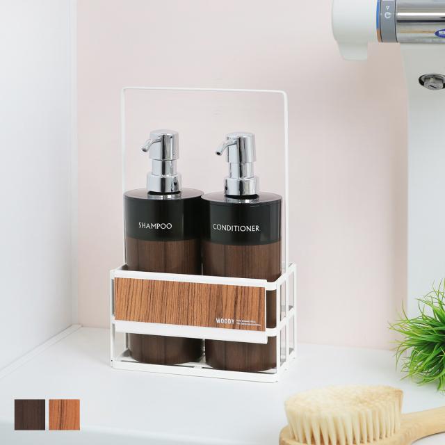 WOODYシリーズ角型・丸型のディスペンサーが2本ぴったり収まります。高すぎず低すぎない持ち手は使いやすく、ポンプを押す際も邪魔になりません。