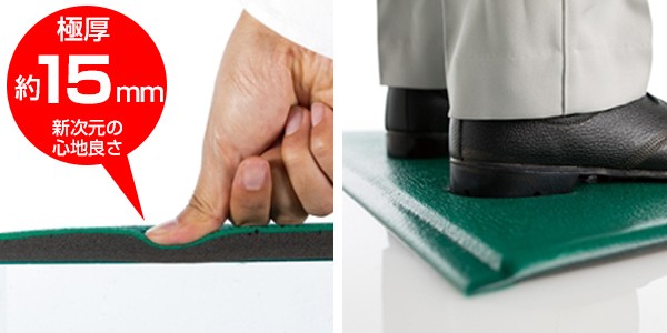 ●マットの厚みは極厚の約15mmでとても心地よく、長時間の立ち仕事も快適にします。