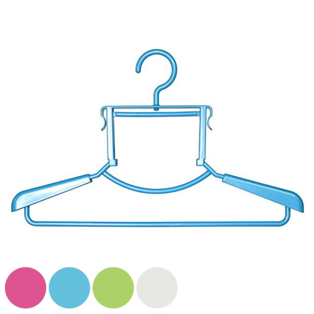 | 小物をちょっと掛けできる ネック下にあるバーは、ネクタイやストールを掛けたり、ハンガーを連結させたりする時に便利です。 | クローゼットが華やかに カラーはパール系のピンク、ブルー、グリーン、ホワイトの4色から選べます。カラフルな色なので、家族で色分けして使うのもおすすめです。 |